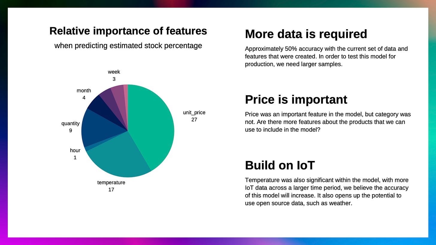 Based on the 3 sample datasets used, the insights of the predictive model used to predict hourly stock levels of Gala Groceries’ products is shown in the visual below: