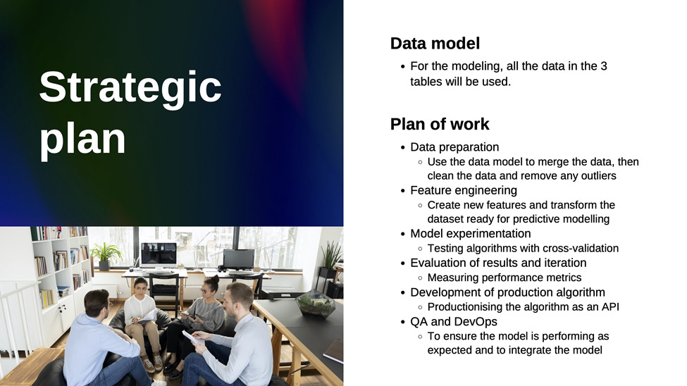 Summarize the data that you want to make use of and the strategic plan of action in a single PowerPoint slide. This will be sent to the Data Science team leader and the client, so be sure to be concise and use business-friendly language.