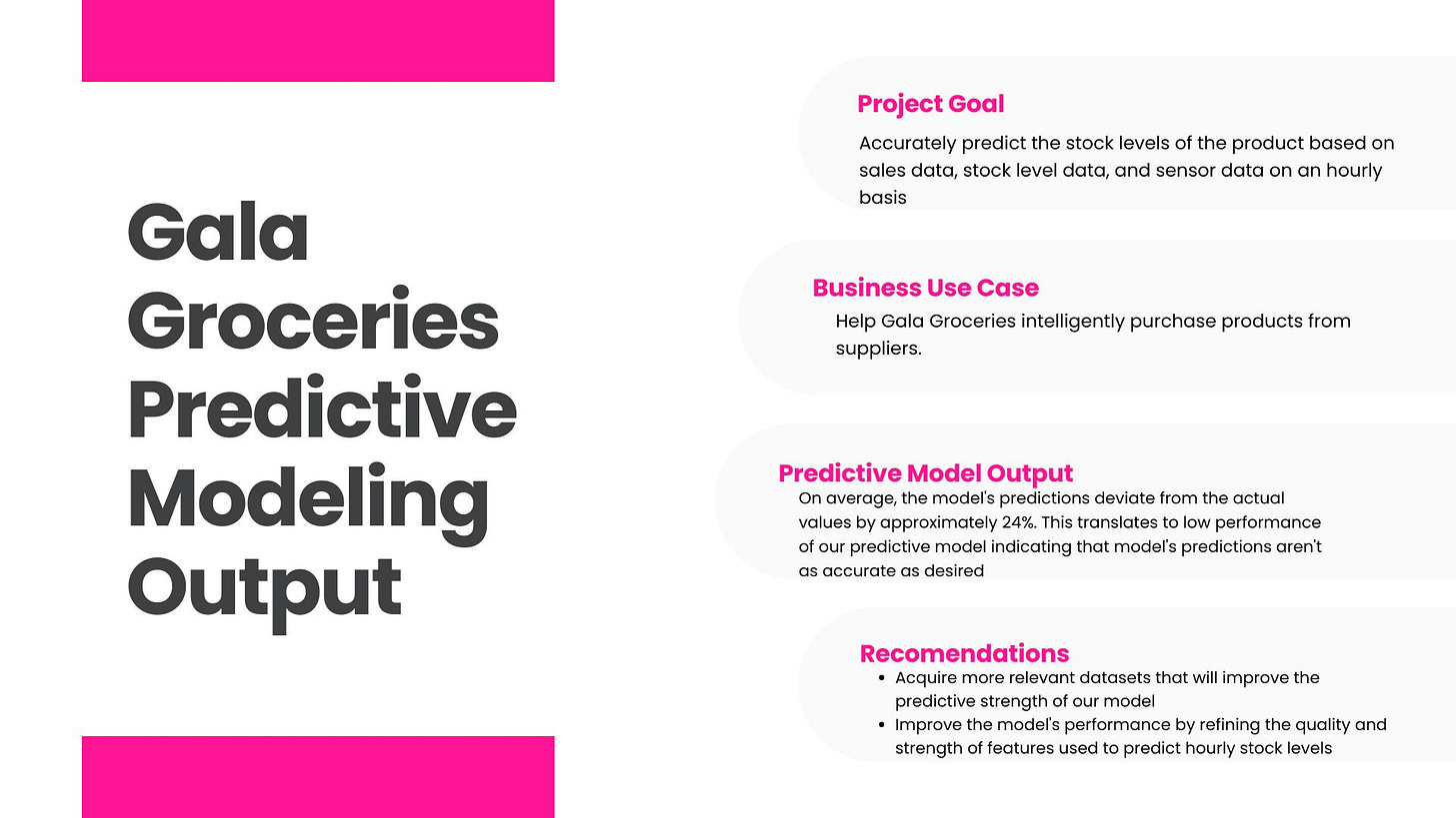 Key recommendations Gala Groceries can adopt in order to accurately predict the stock levels of products based on the predictive model’s output: